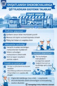 ✅ Bu shaxobchalarda sanitariya-gigiyena qoidalariga rioya etilishi, oziq-ovqat mahsulotlarining xavfsizligi va sifati ta’minlanishi aholi salomatligini muhofaza qilishda muhim ahamiyatga ega.