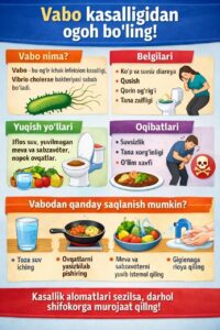 🖍Vabo (cholera) – ingichka ichakning zararlanishi, intoksikatsiya, umumiy ahvolning ogʻirlashuvi va organizmning suvsizlanishi bilan davom etadigan oʻtkir infeksion kasallik; oʻta xavfli ichak kasalliklaridan biri hisoblanadi.