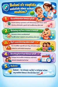 Shu bois yurtimizda Milliy profilaktik emlash kalendari joriy etilgan bo’lib, unga ko’ra, bolalar 13 turdagi yuqumli kasalliklarga qarshi rejali emlanadi.