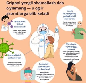 Siz quyidagi infografika orqali gripp va o‘tkir respirator virusli infeksiyalar (O‘RVI) nafaqat bolalarda, balki kattalarda ham jiddiy oqibatlarga sabab bo‘lishi mumkinligi haqida ma’lumotga ega bo’lasiz.
